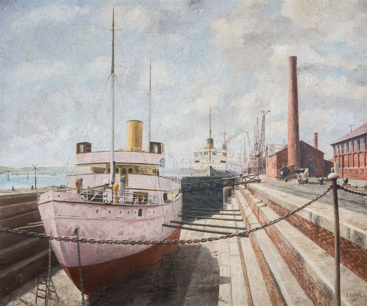 'Dry Dock, Southampton' (1935), oil on canvas, 61.5 x 75 cm, Collection: Barings PLC, UK, Photo by Paul Carter, © Richard Eurich Paintings