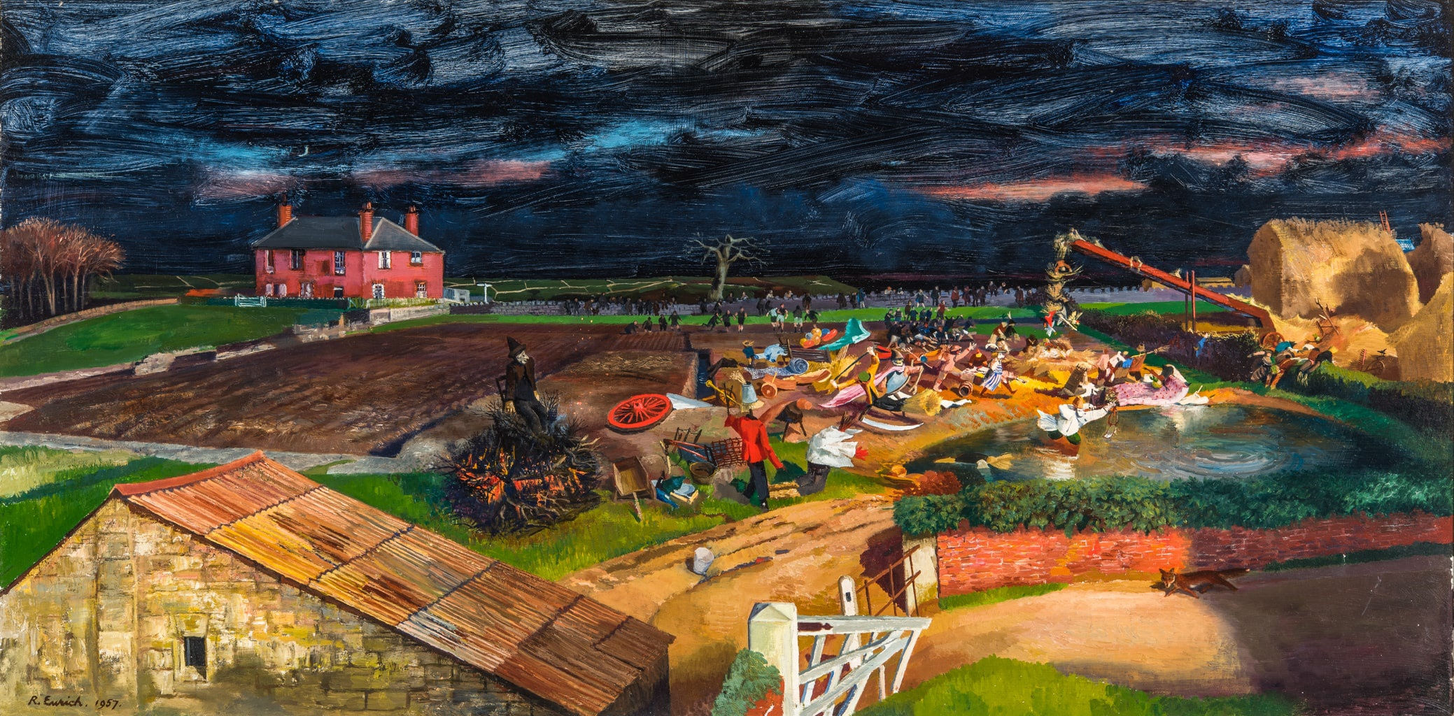 'Men of Straw' (1957), Oil on panel, 50.8 x 101.6 cm, Collection: Nottingham Castle, Museum and Art Gallery, Nottingham, Nottinghamshire, Photo by Paul Carter, © Nottingham Castle Museum and Art Gallery / Richard Eurich Paintings