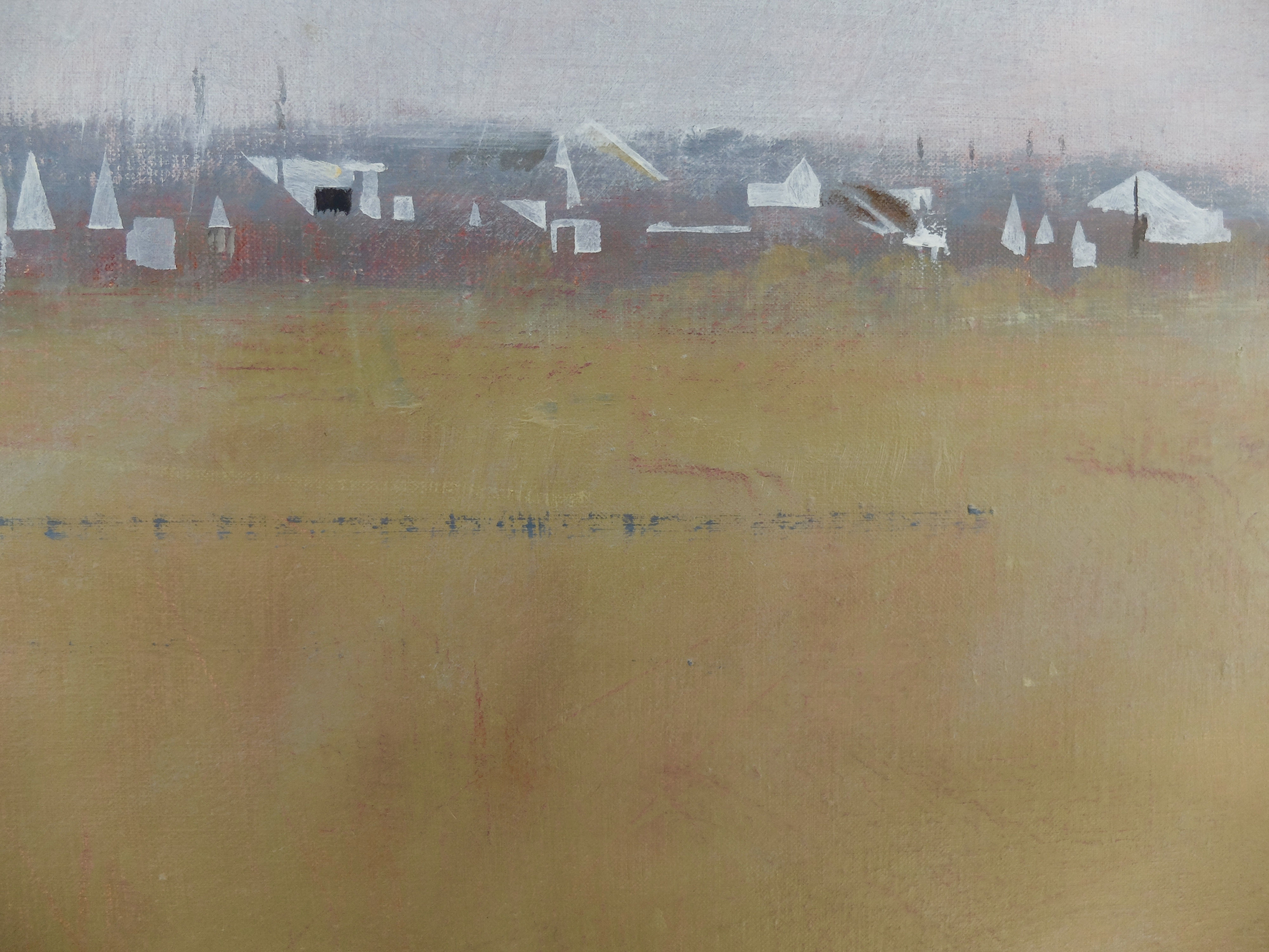 However, as I was walking on the beach, I noticed how the low sun lit the walls and roofs of the thin line of houses receding into the distance and was struck by the way these angular, crystalline shapes defined the border between the sky and the ground. My work has always been about the visual flip-flop between abstraction and depiction, so the way that these houses were dissolving and distilled by distance to basic geometric shapes was very pleasing.