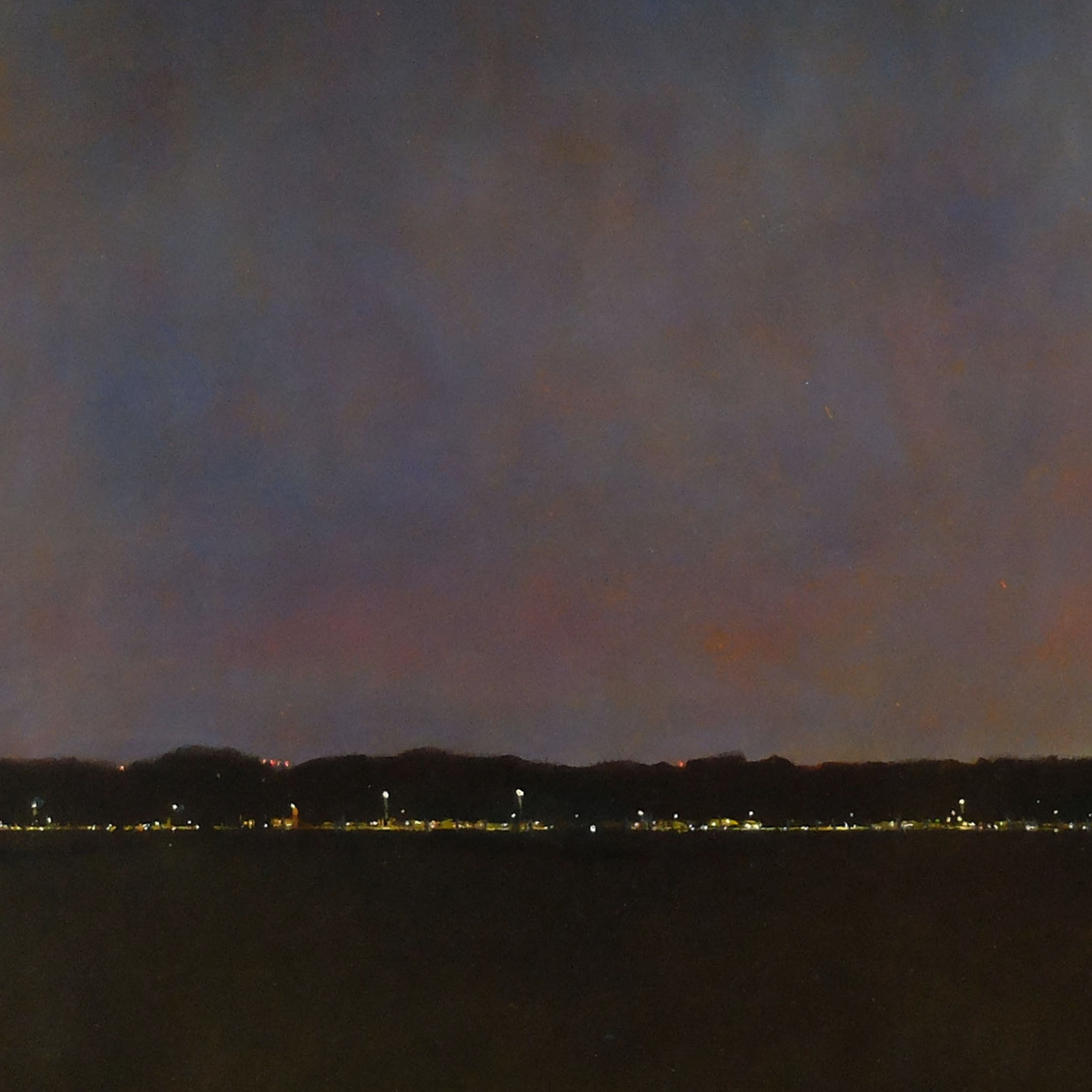 The syncopated, skittering rhythm on the horizon was something that I had been interested in while painting an earlier series of the commons of London at night. In these nocturnes, I liked how the street lights and traffic made a rhythm too.