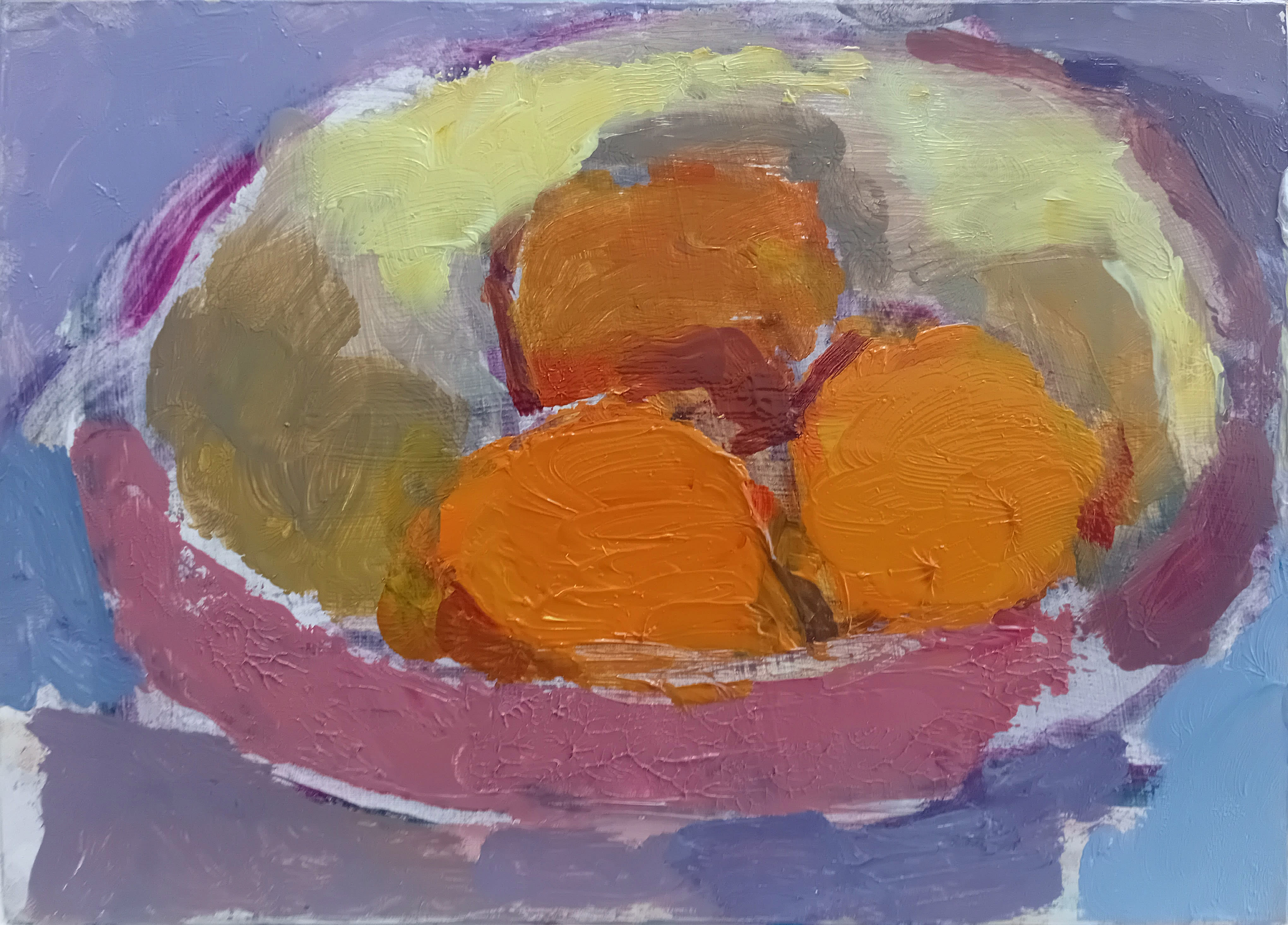 I paint simple things: cups, bowls, fruit, a milk bottle. I move them around till they seem interesting.