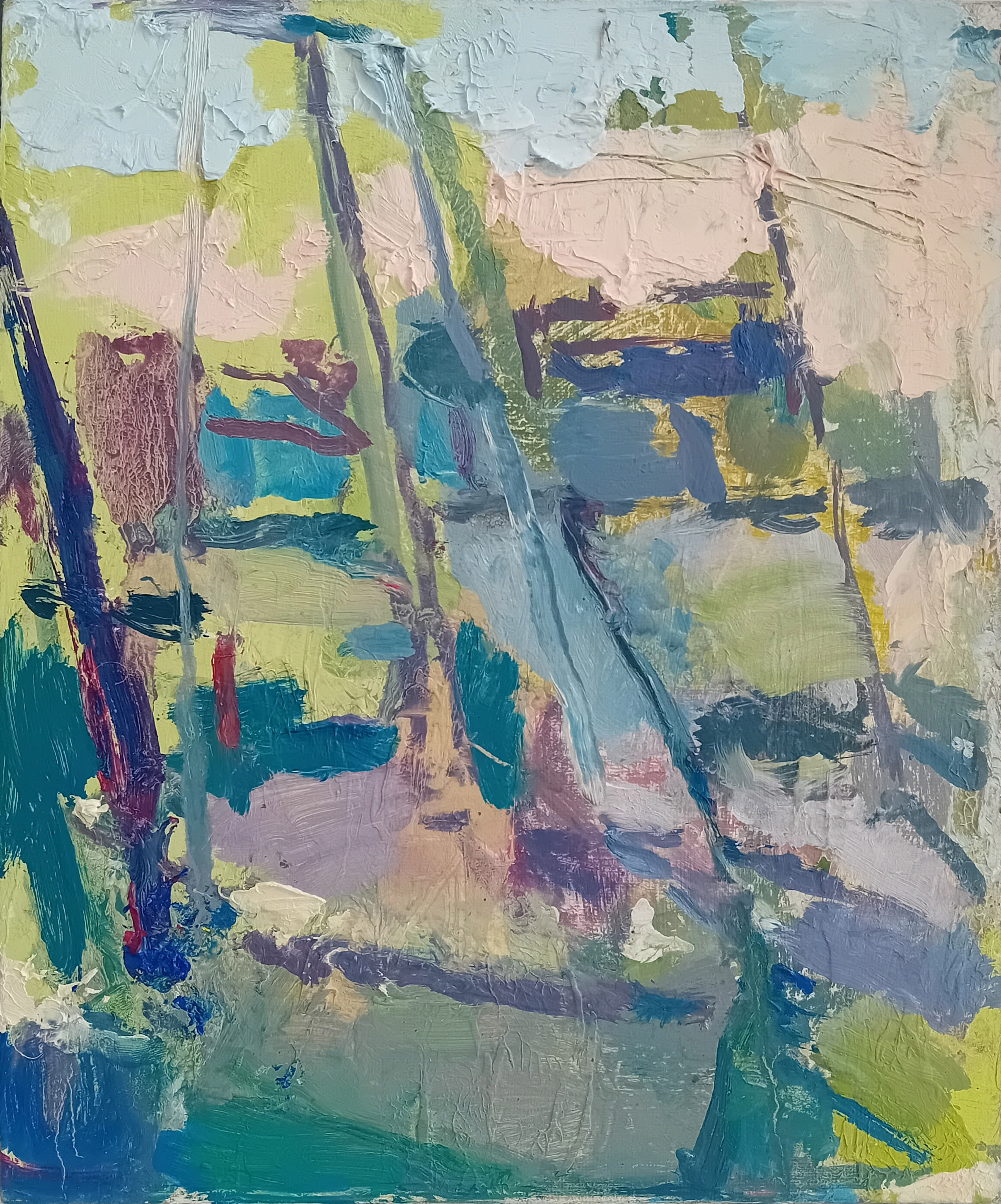 I take my paints to the yacht club by the pier. It’s quiet there, though the boats catch the wind and make eerie clinking sounds.