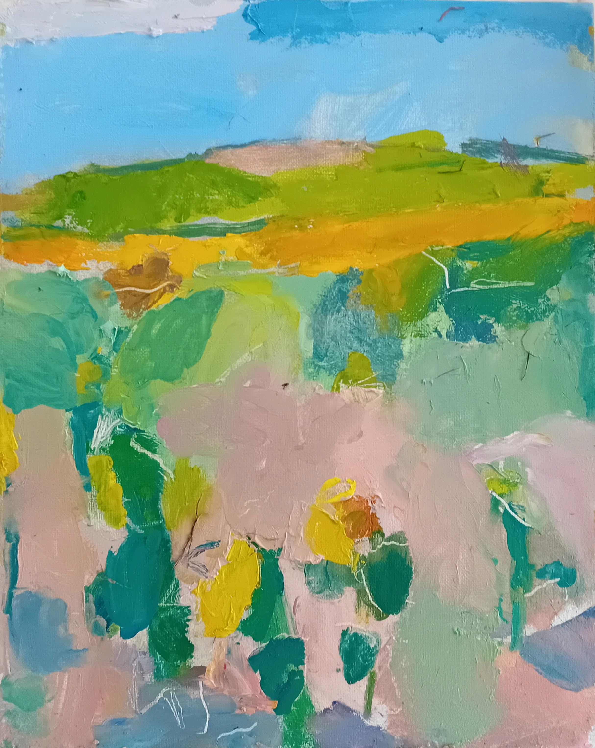 I join a competition to paint in a sunflower field. There’s a stand that sells coffee. I tell the girl I’ve never painted sunflowers. She says it’s going to be great. There are other people painting too. I ignore them and do my painting. If I abstract it a bit, it will be all right.