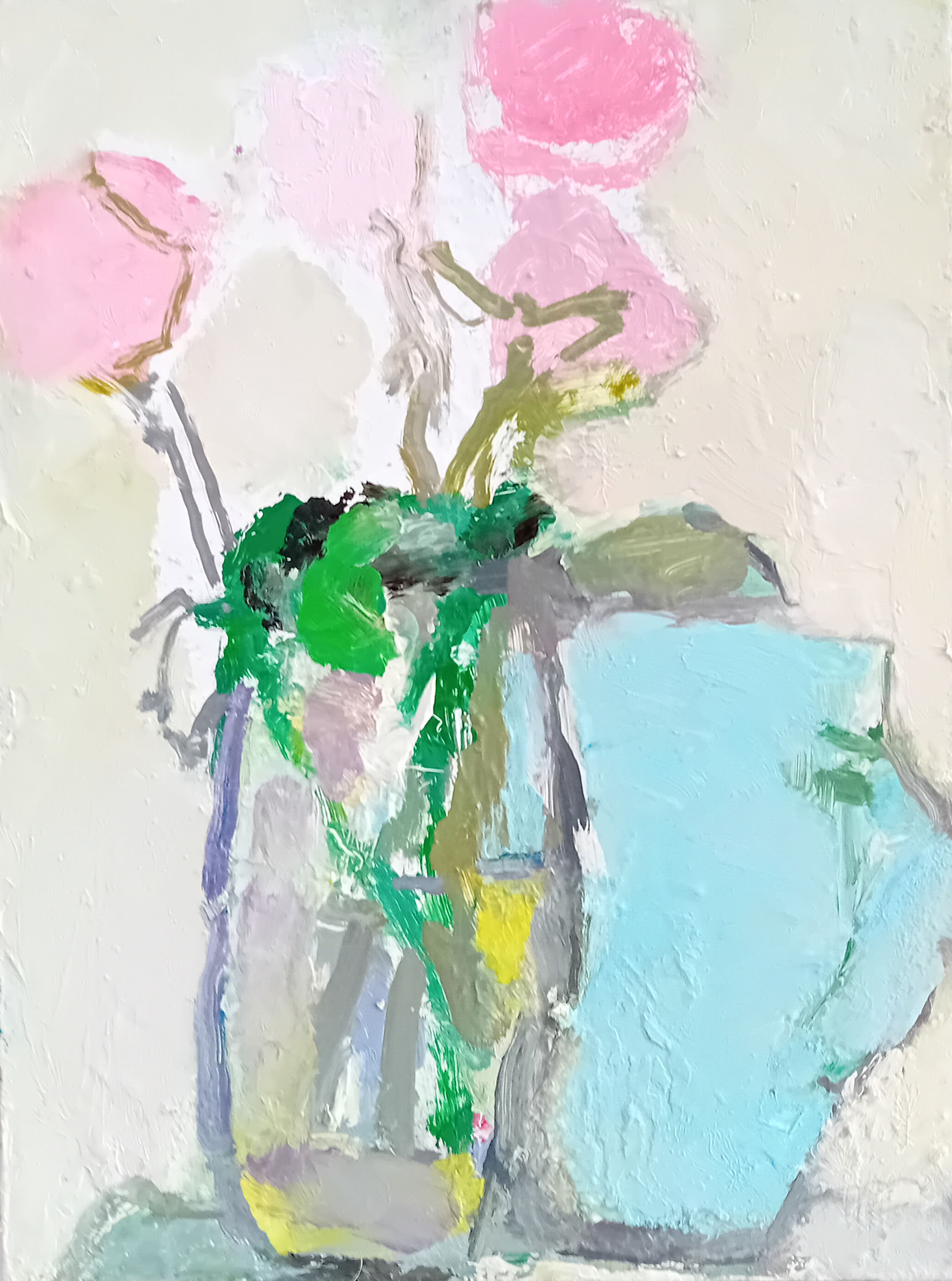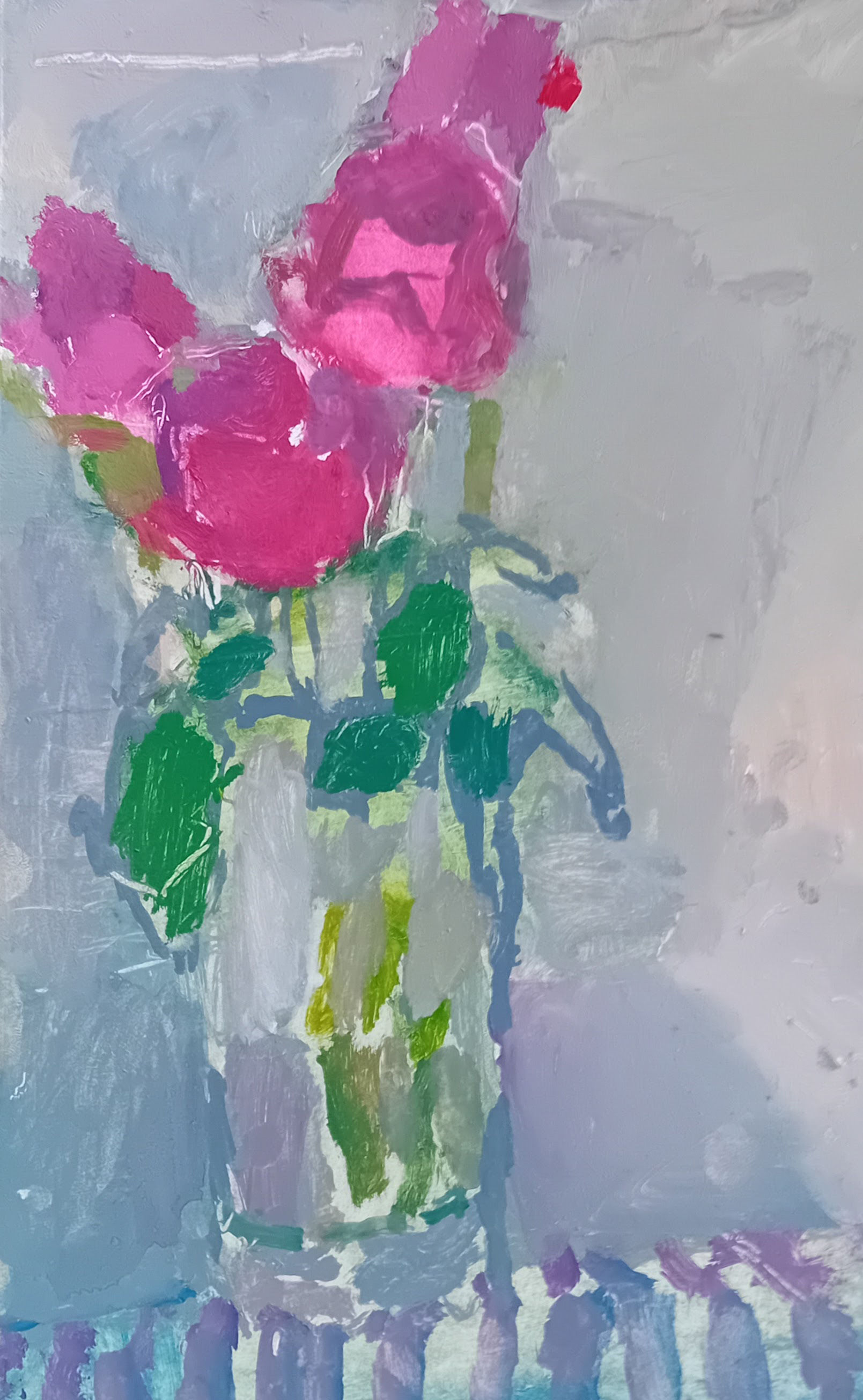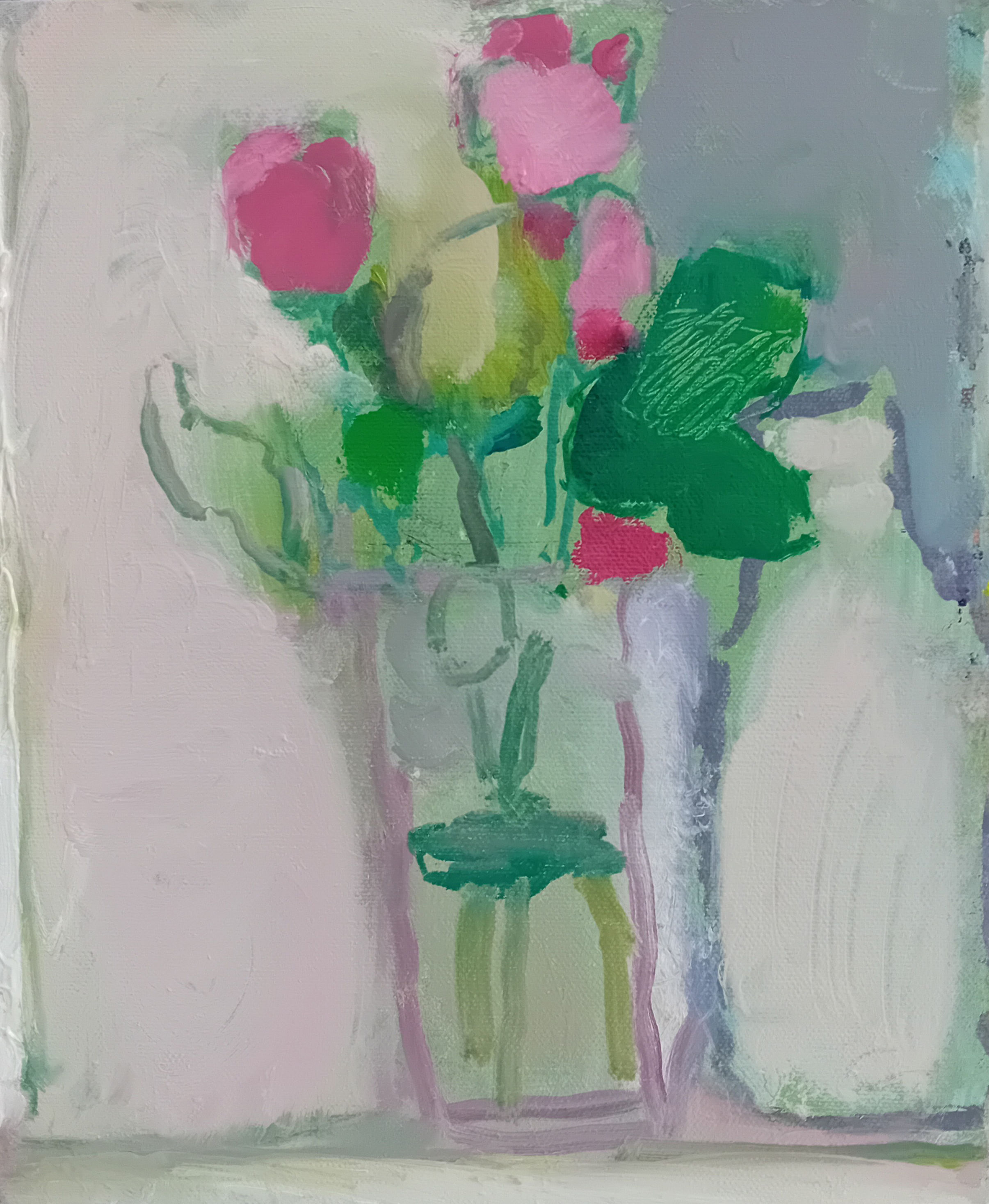 I try painting roses in a glass. I envy artists who can do this. I tell myself, “I can paint it in a more modern way, more abstract.”