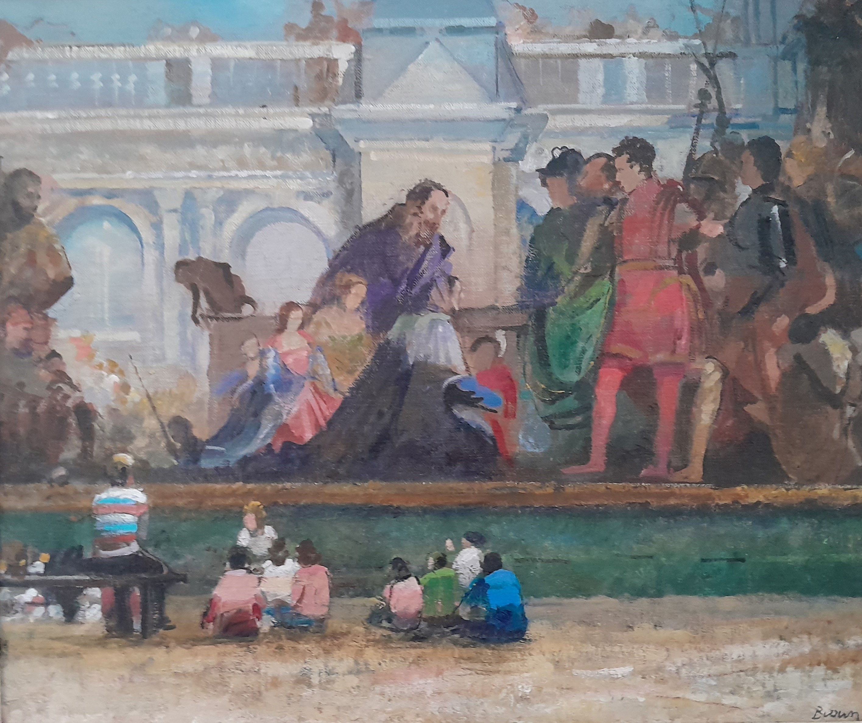"I went to this year's NEAC Critic's Lunch and Private View last week. In a quiet period, I slipped away and went to the National Gallery and sat in front of Paolo Veronese's 'Darius Surrendering to Alexander', a huge masterpiece that puts us all in the shade. It was one of Bob's favourite paintings. Perhaps, like his love of Wagner, it appealed to his admiration for the grand. He painted this picture of this scene in the National Gallery, with visitors lingering in front of Veronese's great work.