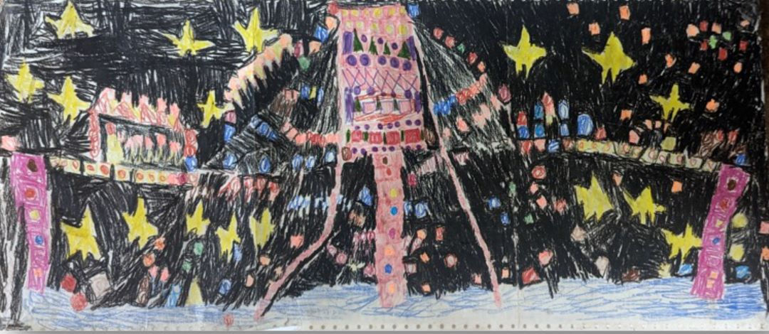 The Humber Bridge at Night (wax crayon on 1970s computer paper) by Neil Pittaway, aged 5